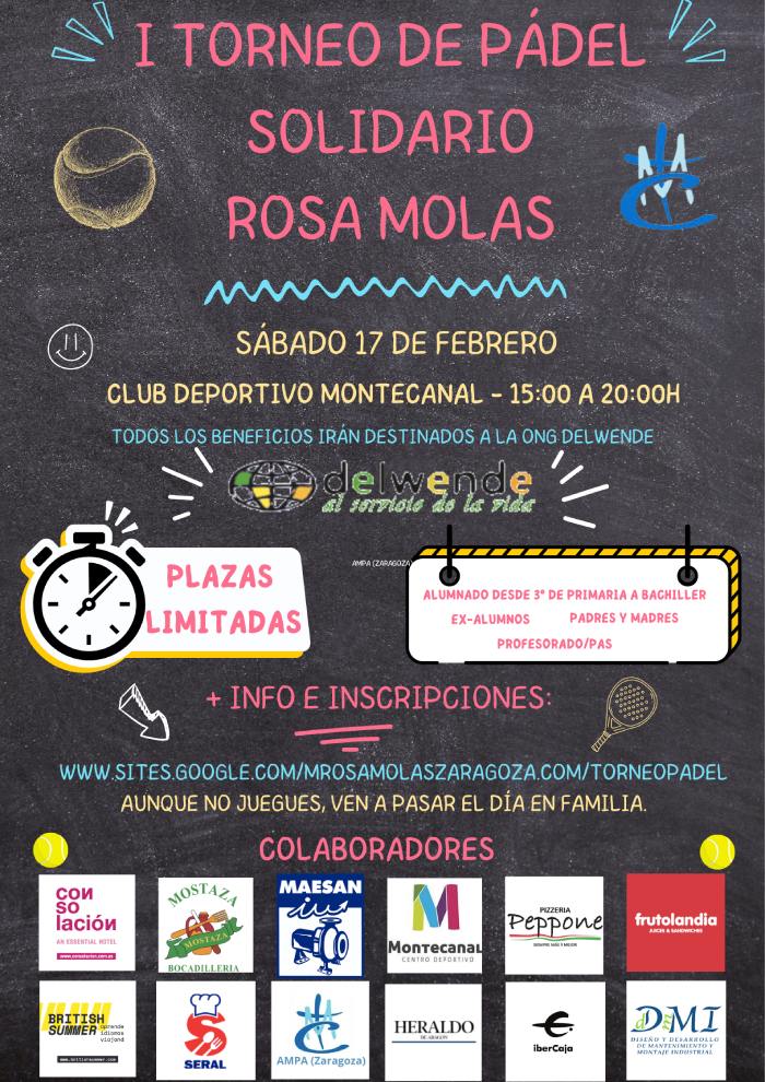 El próximo 17 de febrero tendrá lugar el I Torneo Solidario de Pádel Rosa Molas. Será de 15h a 20h en el Club Deportivo Montecanal. Además del Welcome Pack habrá premios para los ganadores en las diferentes categorías.