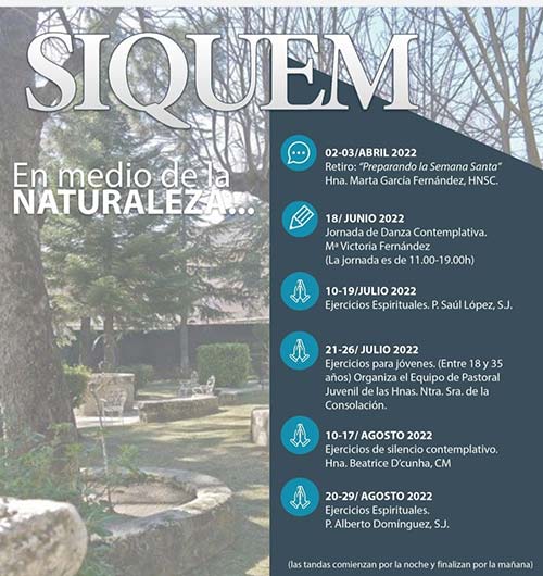 La casa de Espiritualidad Siquem de las Hermanas de la Consolación en Cercedilla organiza una serie de jornadas y ejercicios espirituales durante los meses de abril, mayo, junio, julio y agosto.